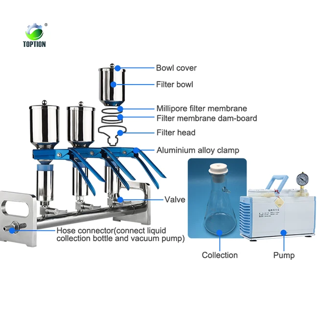 1)SS316L Grade Stainless Steel, durable & greatly reduce man-made damage. 2)Easy to 180℃ high temp. disinfection / sterilization. Make analysis result be accurate and reliable. 3)High corrosion resistance, acid & alkali resistance. Ideal solution filter for chemical laboratory. 4)Design separate valve, can filter single sample or multiple samples at the same time, greatly save time. 5)Filter 4 samples at the same time, high efficient. 6)Aluminium alloy clamp connect filter bowls & head, ensure tightness and no gas & liquid leakage. 7)Reasonably structure, easily cleaning and operating. 8)Filter without welding points, good appearance. 9)Suitable filter membrane: Φ47 / Φ50. 10) Equipped with oil free diaphragm vacuum pump, high efficient filteration.